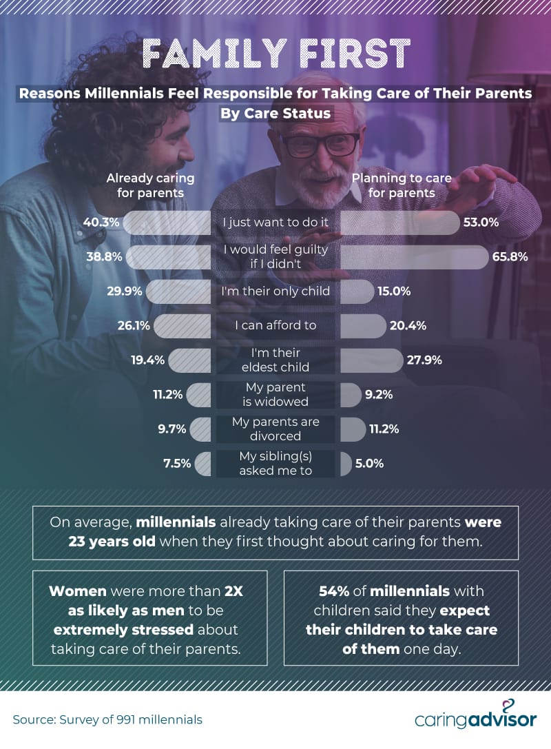 Guilt was the biggest motivating force for millennials planning to take care of their parents down the road. When asked about the reasons they felt responsible for such care, 65.8% of planning-stage millennials said they would feel guilty if they didn’t, and 53% said they simply wanted to do it. Once in the planning stage, many respondents also echoed a certain lack of choice: 29.9% said the care fell to them as the only child, and another 19.4% said it was because they were the eldest child.