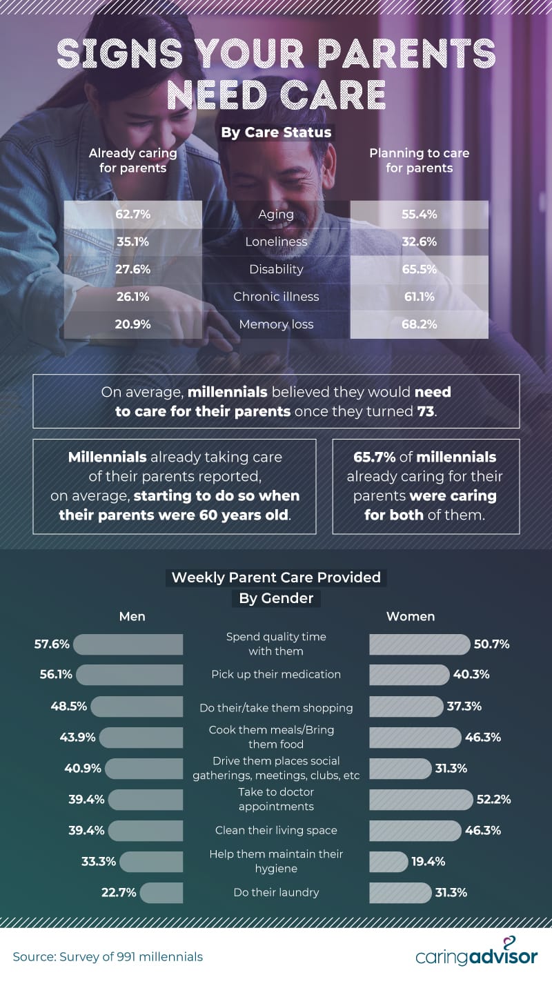 Caretakers, both male and female, sprang to action most often when their parents showed general signs of aging. This was in stark contrast to those millennials who had not yet begun to care for their parents and were still in the planning stage. Inexperience led this group to believe that there would be something more jarring, like memory loss (68.2%) or disability (65.5%), that sparked the need for care. In reality, however, it’s simply the subtle forms of getting older that cause parents to start leaning on their children in old age.